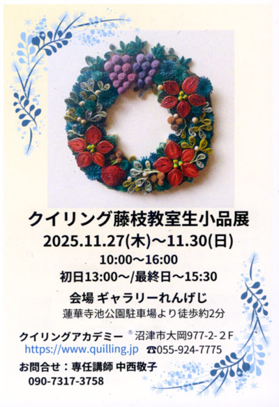 藤枝教室クイリング小品展(専任講師 中西敬子先生)開催のお知らせです。